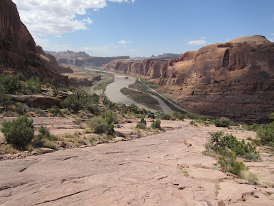 Headed up the Moab Rim Trail from the river in the morning, following a long line of Jeeps that had just started up. Climbing 900 feet in a bit under a mile, entirely on slickrock, this was my kind of trail and Allison gave me the nod to do my thing. I took off up the trail, with the intent of competing with the Jeeps, further inspired by the insistence of one of the workers at the B&B that suggested it would take us 45 minutes to get to the rim overlook. I was a little bogged from breakfast still, but my legs felt springy and I got into a good groove. Passing the Jeeps was WAY easier than I thought, but even so, turned on the gas a bit as I passed just to show them up (most of the drivers/passengers were the sedentary type and looked/commented in awe as I floated past). Also proved the B&B gal wrong in her 45 minute estimate, topping out in 13 minutes. Turned around to meet Allison, who was surprisingly just a minute or so down the trail (though she had a few minute head start).